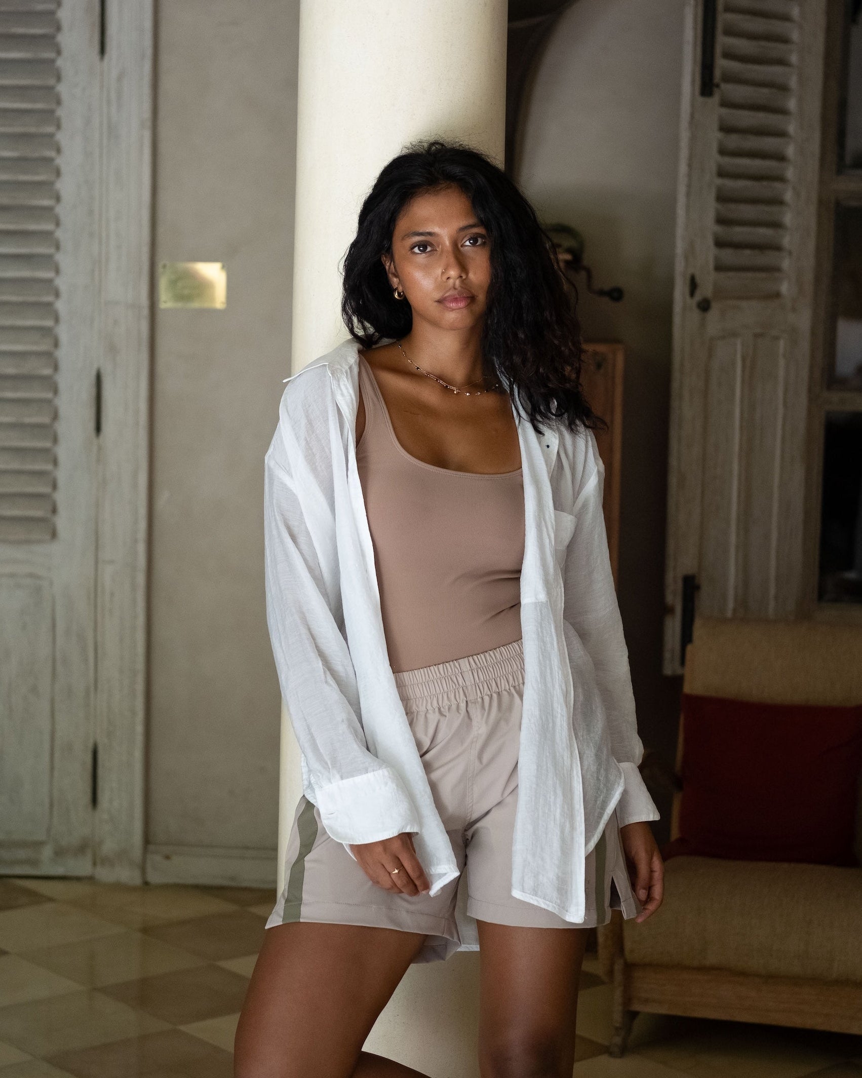 少し長めの丈がヒップや太ももを自然にカバーしながら、スタイルよく見えるシルエットに。
