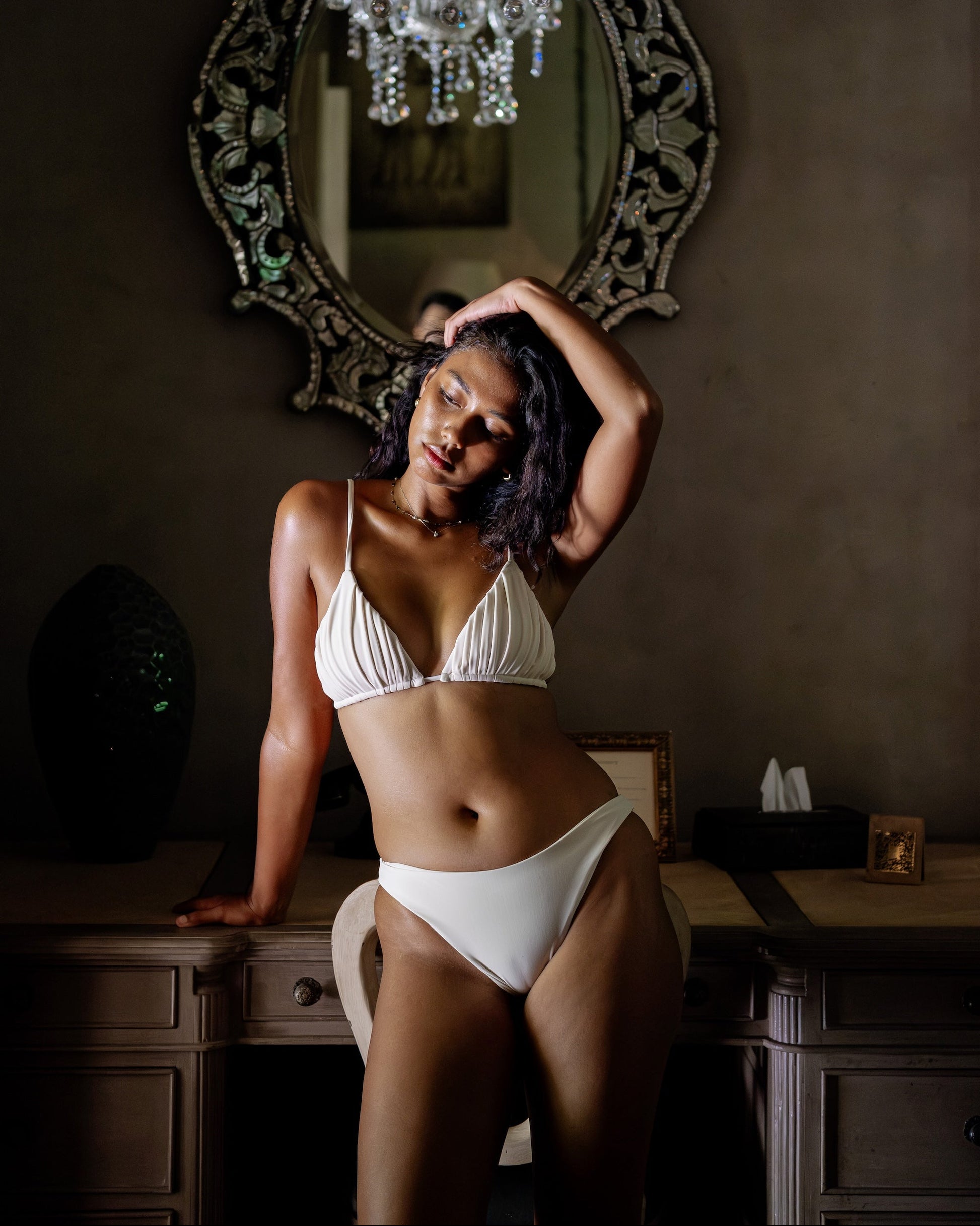 シェルをモチーフにしたデザインが、他にはない存在感を放つトライアングルビキニ。